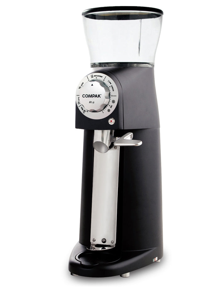 | Grind large batches of coffee for your customers or cafe with the Compak R8 Grinder. Designed with 83mm flat burrs and the ability to grind for any method with precision, it’s a stellar choice for cafes that constantly brew drip coffee or sell a lot of ground coffee. Features : Constructed of cast aluminum Micrometric regulation Regulation from fine to French Press Motor with fan Bag shaker extension Aluminum front regulator Hopper Capacity: 1.1kg RPM: 1290 Motor: 610W Weight: 21.2kg Burrs: 83mm Dimensions: HxWxD / 595 x 205 x 315 (MM) |